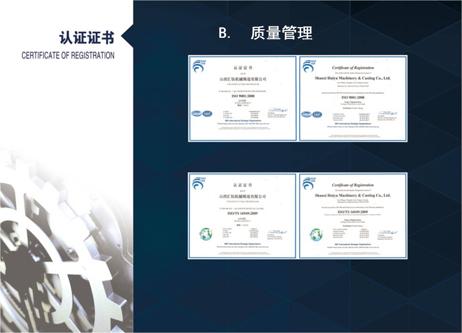 山西匯鈺機械鑄造有限公司創(chuàng)建于2013年,是峰巖鑄造集聚區(qū)建設(shè)的首期工程項目,于2016年6月經(jīng)國家工信部《鑄造行業(yè)準入條件》審核,獲得第三批準入?,F(xiàn)己建成兩條年產(chǎn)3萬噸消失模鑄造自動生產(chǎn)線并投產(chǎn)運行,配套美國應(yīng)達3噸、6噸熔化爐以及20噸保溫爐;檢測儀器有德國OBLF光譜分析儀、爐前快速熱分析儀、金相顯微鏡、碳硫分析儀、拉力試驗機和硬度計等。具備灰口鑄鐵、合金鑄鐵、球墨鑄鐵、蠕墨鑄鐵、奧貝氏體球鐵等鑄件產(chǎn)品的開發(fā)和生產(chǎn)能力。目前主要產(chǎn)品有:電機機座、紡機配件、水泵、閥門、電力系統(tǒng)配重、箱體等六大系列,共計2000余種。